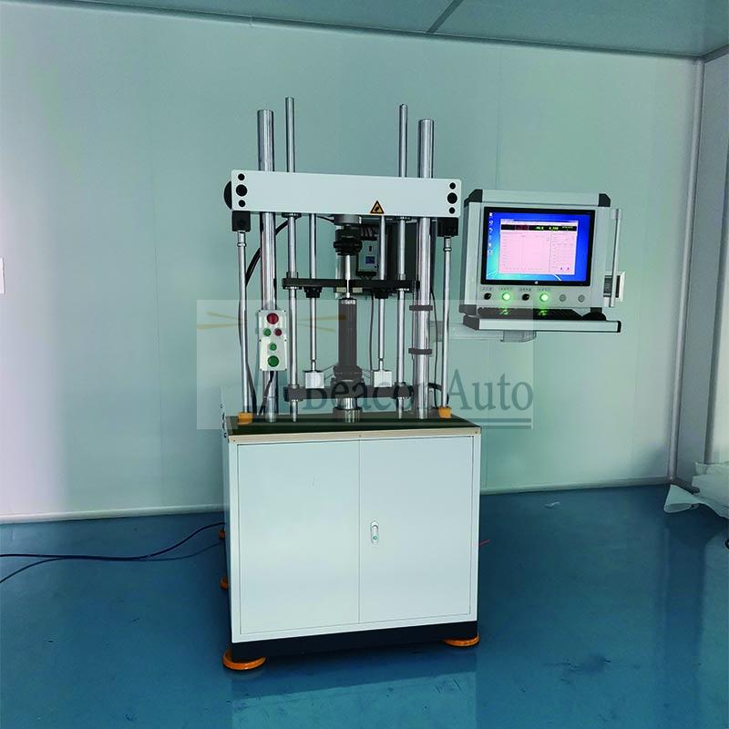 汽車減震器示功疲勞綜合試驗機產品概述:WPW-30A 微機控制減震器示功疲勞綜合試驗臺主要用于對各種汽車、空氣懸掛氣囊減震 器、改裝車、SUV、裝甲車、輕卡、重卡、沙灘車等減震器及各種汽車等機動車所使用的減振 器進行示功試驗、線速度試驗、疲勞壽命試驗等。也可制作特種夾具,以適應特殊試樣的疲勞 試驗。 汽車減震器示功疲勞綜合試驗機設備結構的描述 該機為單工位操作,整體為立式雙柱式結構,由機座、上橫梁及升降機構、阻尼力檢測 系統、驅動機構、減振器缸筒壓緊機構、示功及疲勞工裝、液壓系統、采集卡、計算機、工 控軟件及電控系統、快插接頭可選等組成。 1、機座:采用工業級槽鋼和鋼板焊機而成長方形框架,焊道均勻美觀。具備足夠的強度及剛 度,為了保證操作安全。 2、上橫梁及升降機構:由橫梁、兩橫梁導向立柱、兩升降液壓缸、橫梁鎖緊機構、液壓等組 成。液壓缸驅動橫梁上下移動并在停位位置液壓自動鎖緊,從而控制設備的安裝高度,使測 試行程位于減振器行程中段。 3、活塞桿頂緊及回拉機構:由液壓缸、導向及連接機構、力傳感器及夾具等組成,實現活塞 桿夾緊后回拉到工作位置。 4、阻尼力檢測系統:由力傳感器和手動裝夾裝置等組成。力傳感器用于對工件運動過程中的 拉伸及壓縮力值進行實時監測。 5、驅動機構:由伺服電機、減速機、齒形帶、齒形帶輪、軸承座、主軸、曲柄、滑塊及導向 裝置等組成。電機減速機為運動部分提供動力。通過齒形帶和主軸的傳動,將動力傳遞到曲 柄滑塊機構,用以實現帶動工件按正弦運動。 6、減振器缸筒壓緊機構:由位移傳感器、壓緊油缸、上壓緊板、導柱、底座等組成。由油缸 驅動上壓板上下滑動,實現對減振器缸筒的壓緊。通過位移傳感器監控導向器壓裝行程是否 到位。 7、示功工裝:由減振器吊環快速夾緊工裝及減振器缸筒壓緊工裝組成,工裝采用快換結構。 上吊環采用通用結構,手工放入后,采用機械式加緊兩種。 8、液壓系統:由油箱、單向閥、換向閥、調壓閥、電機、油泵、空氣濾請器等組成,為工件 夾緊及上橫梁升降提供動力。液壓系統的導向器頂緊油缸及吊環頂緊油缸的油路分別加調壓 閥、壓力表來控制及顯示油路壓力。 9、采集卡:用于力及位移信號的采集與轉化。 10、計算機(采用 XP 系統):用于對采集卡采集信號的接收,并通過安裝的工控軟件進行運算、 分析、繪制 P-S 圖和 P-V 圖,顯示最大拉伸及壓縮阻尼力,設置、上下限,不合格屏顯報警 并加裝紅綠燈顯示。 11、電氣控制系統:由伺服電機驅動器、電氣元件、電氣回路及電控箱等組.成。設有手動及自動兩種操作模式,設備增加原點開關,保證一鍵復位。 汽車減震器示功疲勞綜合試驗機功能和特點: 1) 系統設置保存功能:測試系統可對力和速度的設置進行保存; 2) 自檢功能:可對設備自檢,查看設備是否正常; 3) 運行調整功能:將位移傳感器殼體上移或下移,對位移傳感器校零; 4) 傳感器標定功能:可對力傳感器、位移傳感器和速度進行標定。 5) 力傳感器清零功能:力傳感器下端安裝夾具更換時,且每天第一次試驗區前都需要力傳 感器清零; 6) 單工況測試功能:可對減振器進行單工況測試,可手動測試也可自動測試,實驗完成后, 可將實驗數據保存、讀取和打印。 7) 多工況測試功能:可對減振器進行多工況測試,可手動測試也可自動測試,實驗完成后, 可將實驗數據保存、讀取和打印。 8) 計數功能:可對每 24 小時所試驗的減振器數量(包括合格品數量和不合格品數量),并 可保存、讀取、打印。 9) 示功結果可生成報告(包括數據、圖形),數據以 Excle 文件存儲。 10) 疲勞試驗(可以根據實驗要求,做破壞性試驗。能達到預設次數停機功能、力值衰減曲 線、峰值檢測等) 11) 電感測試:在同一速度要求下,可以給定不同的電流或電壓來測試復原和壓縮阻力. 汽車減震器示功疲勞綜合試驗機設備的技術參數: 1、最大力值:30000N 2、速度:可在 0.01~0.52m/s 之間可調,電機為伺服電機,精度更高,通過控制器可隨意設置 所需的速度,也可設置快捷件,達到常用速度的使用便捷性。 3、行程:0~100mm(人工可調),顯示測試行程。 4、最大阻尼力:單只 1m/s 時 30000N。 5、節拍:兩個速度點≤12 秒/件; 6、測試精度:1%FS 7、試驗竟空間:900mm 微機控制減震器示功疲勞綜合試驗臺生產工藝述: 根據生產品種安裝工裝并根據測試要求調整行程→打開主機及計算機電源進入測試程序 →上件,按下啟動按鈕→缸筒頂緊裝置將工件頂緊定位→驅動機構帶動工件開始示功→顯示 系統在同一界面分別繪制示功圖并顯示最大拉伸及壓縮阻尼力值,不合格件自動報警并加裝 紅綠燈顯示→如此交替循環工作。 1、不同品種工件更換示功夾具。 2、不同長度工件調整上橫梁初始位置。 3、不同行程工件,調整偏心位置。 1、力傳感器(量程 3T)自身重復精度 1%FS。 更多汽車減震器示功疲勞綜合試驗機資料請聯系我們濟南信標自動化設備有限公司。專業生產液壓萬能試驗機,疲勞試驗機,扭轉試驗機,高溫蠕變試驗機,彈簧試驗機,彎曲試驗機,沖擊試驗機,彎曲強度試驗機,抗拉強度試驗機等。