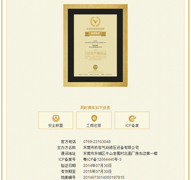 恭喜東莞市玖容氣動液壓設備有限公司獲得了安全聯盟認證!我們通過了128項史上最嚴格的安全檢測,并非常榮幸地載入安全聯盟信譽檔案庫。我們將信守承諾,與安全聯盟200萬站長共同努力,為大家提供安全可靠的產品和服務。玖容增壓缸感謝您的支持!認證詳情請查看榮譽證書http://t.cn/RPICS5j