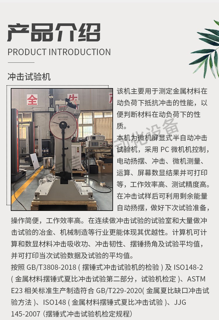 本機(jī)為微機(jī)屏顯式半自動(dòng)沖擊試驗(yàn)機(jī),采用PC微機(jī)機(jī)控制,電動(dòng)揚(yáng)擺、沖擊、微機(jī)測(cè)量、運(yùn)算、屏幕數(shù)顯結(jié)果并可打印等,工作效率高、測(cè)試精度高。在沖擊試樣后可利用剩余能量自動(dòng)揚(yáng)擺,做好下次試驗(yàn)準(zhǔn)備,操作簡(jiǎn)便,工作效率高。在連續(xù)做沖擊試驗(yàn)的試驗(yàn)室和大量做沖擊試驗(yàn)的冶金、機(jī)械制造等行業(yè)更能體現(xiàn)其優(yōu)越性。計(jì)算機(jī)可計(jì)算和數(shù)顯材料沖擊吸收功、沖擊韌性、擺錘揚(yáng)角及試驗(yàn)平均值,并可打印當(dāng)次試驗(yàn)數(shù)據(jù)及試驗(yàn)的平均值。 按照 GB/T3808-2018 (擺錘式?jīng)_擊試驗(yàn)機(jī)的檢驗(yàn))及 ISO148-2(金屬材料擺錘式夏比沖擊試驗(yàn)第二部分,試驗(yàn)機(jī)檢定)、ASTM E23 相關(guān)標(biāo)準(zhǔn)生產(chǎn)制造符合 GB/T229-2020(金屬夏比缺口沖擊試驗(yàn)方法)、ISO148 (金屬材料擺錘式夏比沖擊試驗(yàn))、JJG 145-2007 (擺錘式?jīng)_擊試驗(yàn)機(jī)檢定規(guī)程) 四、主要技術(shù)指標(biāo): 1、沖擊能量:150J、300J 2、擺錘預(yù)揚(yáng)角:150° 3、擺軸中心至沖擊點(diǎn)距離:750mm 4、沖擊速度:5.2m/s 5、試樣支座跨距:40mm 6、鉗口圓角:R1-1.5mm 7、沖擊刀刃圓角:R2-2.5mm 8、沖擊刀厚度:16mm 9、角度準(zhǔn)確度:±0.1° 10、試樣尺寸:10×10×55mm 11、外形尺寸:2124 mm×600 mm×1340 mm 12、試驗(yàn)機(jī)凈重:450Kg 13、電源:交流三相 380V±10% 50HZ 5A 14、環(huán)境條件:周?chē)h(huán)境中無(wú)腐蝕介質(zhì),無(wú)震動(dòng),無(wú)強(qiáng)電磁場(chǎng)干擾。 五、設(shè)備主要配置: 1、300焦耳主機(jī)一臺(tái); 2、150J、300J 擺錘各一個(gè) 3、取擺傳動(dòng)裝置一套(裝在主機(jī)上) 4、自動(dòng)掛擺裝置一套(裝在主機(jī)上) 5、保險(xiǎn)機(jī)構(gòu)一套(裝在主機(jī)上) 6、安全防護(hù)裝置一套 7、擺錘拆卸器一只 8、支座調(diào)校器一只 9、試樣對(duì)中器一只 10、聯(lián)想打印機(jī)一套 專用測(cè)量軟件一套