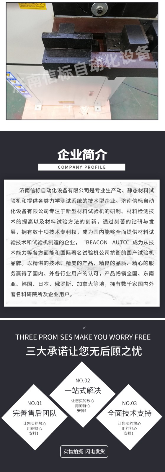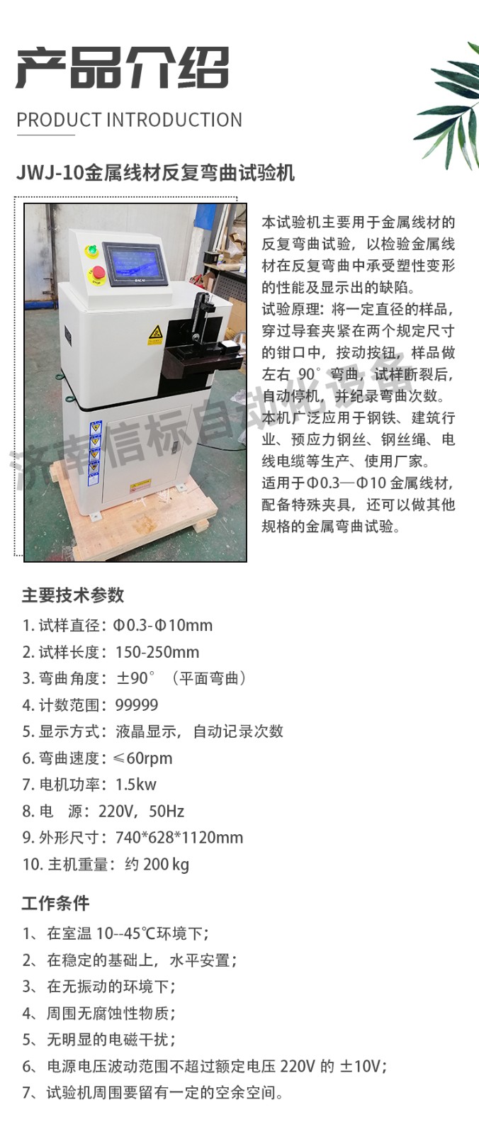 主要技術參數 1.試樣直徑:Φ0.3-Φ10mm 2.試樣長度:150-250mm 3.彎曲角度:±90°(平面彎曲) 4.計數范圍:99999 5.顯示方式:液晶顯示,自動記錄次數 6.彎曲速度:≤60rpm 7.電機功率:1.5kw 8.電 源:220V,50Hz 9.外形尺寸:740*628*1120mm 10.主機重量:約200 kg 結構特征與工作原理 本試驗機主要由主機和電器測控系統兩大部分組成,采用機械傳動,施加試驗力矩使試樣反復彎曲,利用光電開關來檢測彎曲試驗次數。試樣斷裂后自動停機,擺桿復位,液晶表自動顯示,記錄彎曲試驗次數。 主機 主機由電機,通過皮帶輪帶動蝸桿蝸輪副減速,再由曲柄—擺桿機構,帶動圓柱齒輪傳動,圓柱齒輪帶動擺桿做±90°回轉,從而使擺桿上的導套帶動試樣做±90°的彎曲,達到試驗的目的。在圓柱齒輪上裝有記數用的裝置,試樣每彎曲一次,光電開關采集一次信號,這樣就達到了記數的目的。 試驗結束后,如果擺桿沒有停到中間位置,按復位鍵,則由另一只光電開關采集信號,使擺桿恢復到中間位置。 在擺桿上,裝有撥桿,而撥桿上裝有內徑大小不同的導套,針對不同粗細的試樣,把撥桿調整到不同的高度,并使用不同的導套。將導套放入撥桿孔內,用扭簧將其別住,并使其與撥桿導通。 在擺桿的下方,裝有試樣夾持裝置。手動旋轉絲杠,使活動鉗口平移,將試樣夾緊。對不同直徑的試樣,更換相應的鉗口和導套(鉗口和導套上有標記)。