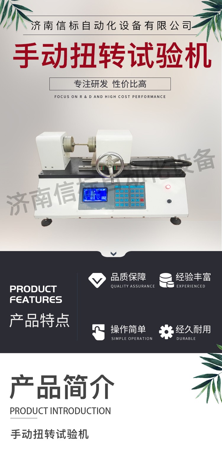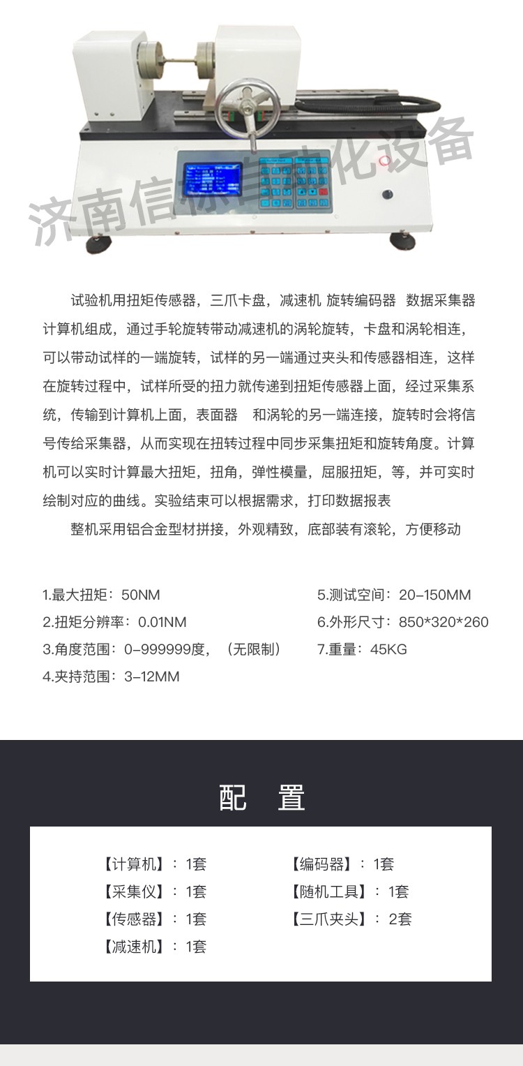 一、介紹 試驗機用扭矩傳感器,三爪卡盤,減速機 旋轉編碼器 數據采集器 計算機組成,通過手輪旋轉帶動減速機的渦輪旋轉,卡盤和渦輪相連,可以帶動試樣的一端旋轉,試樣的另一端通過夾頭和傳感器相連,這樣在旋轉過程中,試樣所受的扭力就傳遞到扭矩傳感器上面,經過采集系統,傳輸到計算機上面,表面器 和渦輪的另一端連接,旋轉時會將信號傳給采集器,從而實現在扭轉過程中同步采集扭矩和旋轉角度。計算機可以實時計算最大扭矩,扭角,彈性模量,屈服扭矩等,并可實時繪制對應的曲線。實驗結束可以根據需求,打印數據報表,整機采用鋁合金型材拼接,外觀精致,底部裝有滾輪,方便移動。試驗機用扭矩傳感器,三爪卡盤,減速機 旋轉編碼器 數據采集器 計算機組成,通過手輪旋轉帶動減速機的渦輪旋轉,卡盤和渦輪相連,可以帶動試樣的一端旋轉,試樣的另一端通過夾頭和傳感器相連,這樣在旋轉過程中,試樣所受的扭力就傳遞到扭矩傳感器上面,經過采集系統。 二、基本參數 1.最大扭矩:50NM 2.扭矩分辨率:0.01NM 3.角度范圍:0-999999度,(無限制) 4.夾持范圍:3-12mm 5.測試空間:20-150mm 6.外形尺寸:850*320*260 7.重量:45kg 三配置: 1.計算機:1套 2.采集儀:1套 3.傳感器:1套 4.減速機:1套 5.編碼器:1套 6.隨機工具:1套 7.三爪夾頭:2套