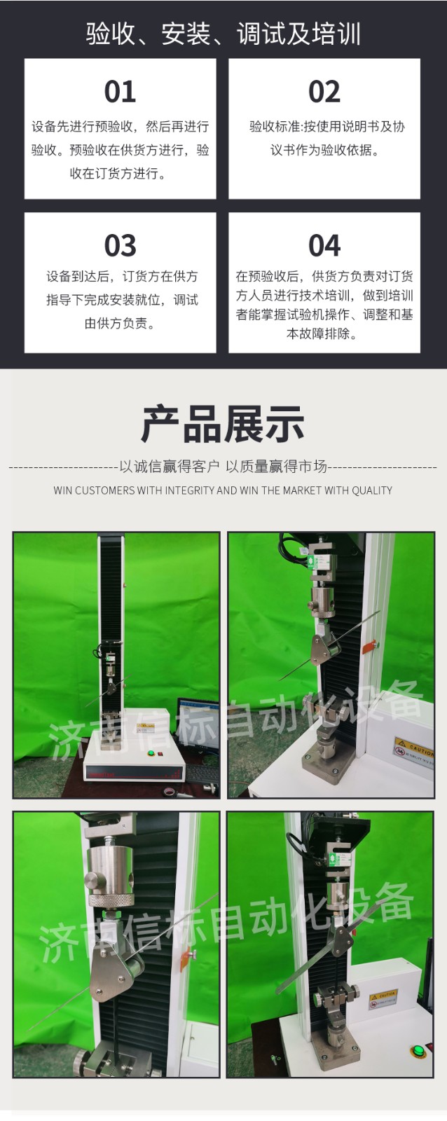 高強度膠黏劑膠帶浮棍法90度180度剝離強度試驗機主要功能及特點: 1、主機: 1.1調速系統采用伺服電機和自主研發減速系統,性能穩定可靠,具有過流、過壓、過載等保護裝置。調速范圍可達0.05~500mm/min。 1.2傳動部分采用圓弧同步齒形帶,精密絲杠副傳動,傳動平穩,噪音低,傳動效率高。 1.3萬向節采用十字插銷結構,而且具有擺角限制功能,一方面便于試樣夾持,保證試驗同心度,另一方面很好的消除了不規則試樣對傳感器的影響。 2、控制系統、操作軟件及數據處理系統 2.1計算機控制系統,具有集成度高、性能穩定、調整方便等優點??梢詫嶒灁祿M行實時采集,對實驗特性曲線實現實時動態顯示,試驗數據文件能以Access常用數據庫或SQLserve大型數據庫的方式保存,方便實現客戶的資源共享及網絡管理,以及用戶的再分析。對于用戶自定義的各種word2000報表,該軟件可輕松實現訪問,解決了不同用戶或同一用戶在不同時期對試驗報表有不同需要的難題。該軟件可處理試驗力、位移、時間、變形的原始數據及由此派生的曲線。