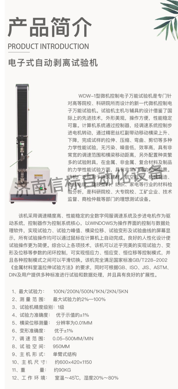 高強度膠黏劑膠帶浮棍法90度180度剝離強度試驗機主要技術指標: 1、最大試驗力: 100N/200N/500N/1KN/2KN/5KN 2、測 量 范 圍: 最大試驗力的2%—100% 3、試驗機精度級別:1級 4、試驗力準確度: 優于示值的±1% 5、橫梁位移測量: 分辨率為0.01mm 6、變形準確度: 優于±1% 7、調 速 范 圍: 0.05-500mm/min 8、試 驗 空 間: 950mm 9、主 機 形 式: 單臂式結構 10、主 機 尺 寸: 約600×420×1150 11、重 量: 約90Kg 12、工 作 環 境: 室溫~45℃,濕度20%~80%