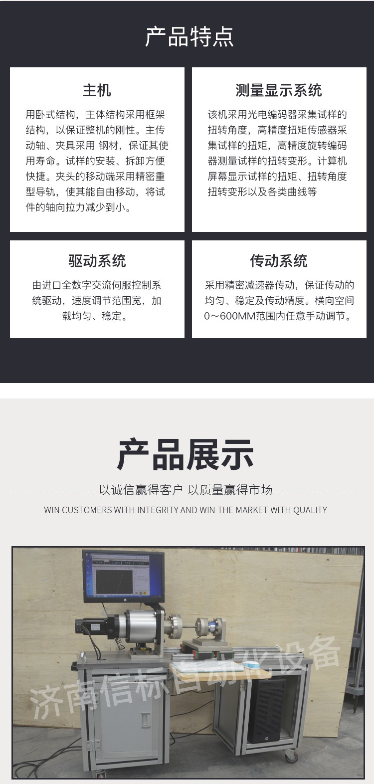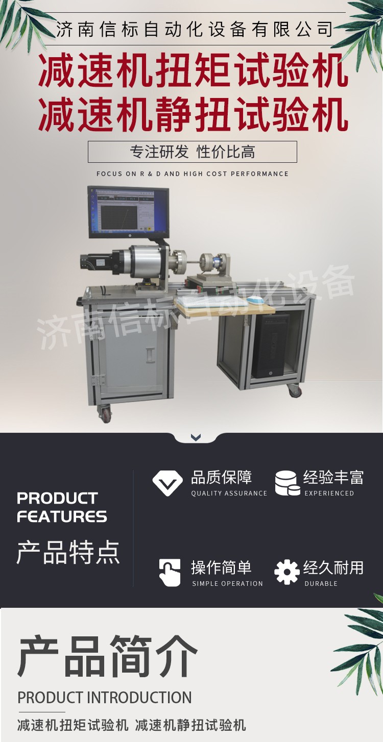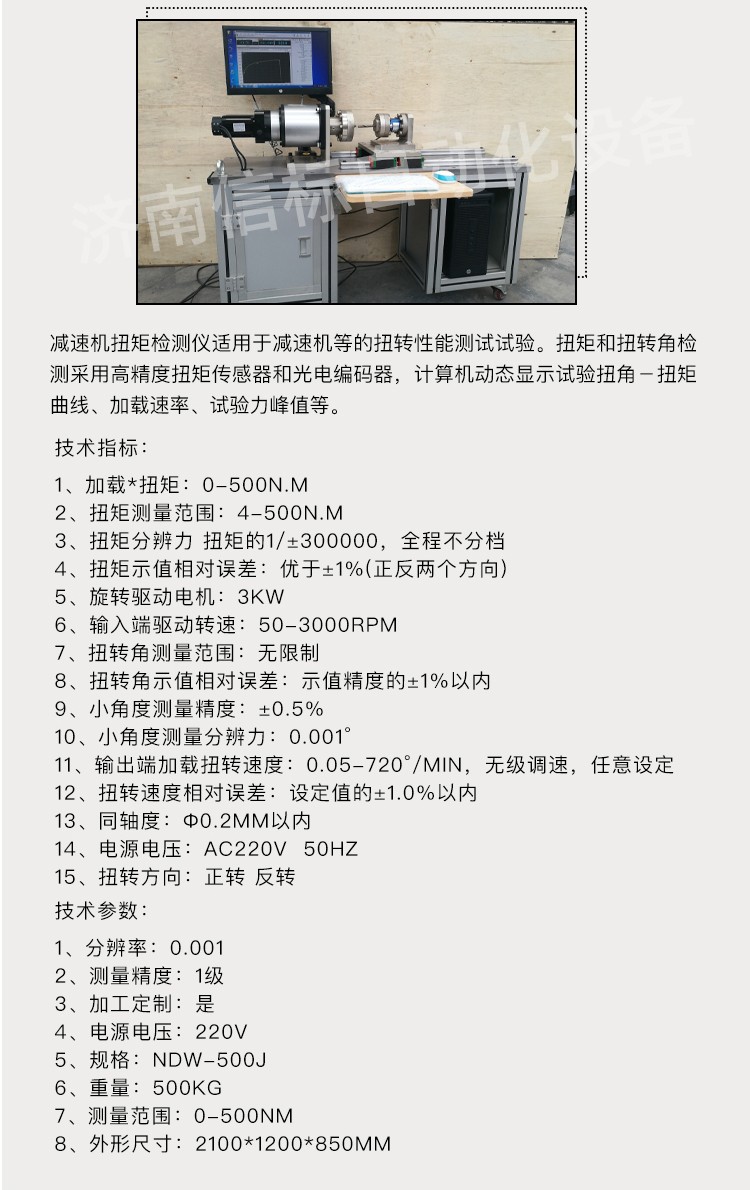 減速機扭矩試驗機 減速機靜扭試驗機產(chǎn)品特點: 1、主機:采用臥式結(jié)構(gòu),主體結(jié)構(gòu)采用框架結(jié)構(gòu),以保證整機的剛性。主傳動軸、夾具采用 鋼材,保證其使用壽命。試樣的安裝、拆卸方便、快捷。夾頭的移動端采用精密重型導(dǎo)軌,使其能自由移動,將試件的軸向拉力減少到 小。 2、驅(qū)動系統(tǒng):由進口全數(shù)字交流伺服控制系統(tǒng)驅(qū)動,速度調(diào)節(jié)范圍寬,加載均勻、穩(wěn)定。 3、傳動系統(tǒng):采用精密減速器傳動,保證傳動的均勻、穩(wěn)定及傳動精度。橫向空間0~600mm范圍內(nèi)任意手動調(diào)節(jié)。 4、測量顯示系統(tǒng):該機采用光電編碼器采集試樣的扭轉(zhuǎn)角度,高精度扭矩傳感器采集試樣的扭矩,高精度旋轉(zhuǎn)編碼器測量試樣的扭轉(zhuǎn)變形。計算機屏幕顯示試樣的扭矩、扭轉(zhuǎn)角度、扭轉(zhuǎn)變形以及各類曲線等。 技術(shù)指標(biāo): 1. 加載*扭矩:0-500N.m 2. 扭矩測量范圍:4-500N.m 3. 扭矩分辨力 扭矩的1/±300000,全程不分檔 4. 扭矩示值相對誤差:優(yōu)于±1%(正反兩個方向) 5. 旋轉(zhuǎn)驅(qū)動電機:3kW 6. 輸入端驅(qū)動轉(zhuǎn)速:50-3000rpm 7. 扭轉(zhuǎn)角測量范圍:無限制 8. 扭轉(zhuǎn)角示值相對誤差:示值精度的±1%以內(nèi) 9. 小角度測量精度:±0.5% 10.小角度測量分辨力:0.001° 11.輸出端加載扭轉(zhuǎn)速度:0.05-720°/min,無級調(diào)速,任意設(shè)定 12.扭轉(zhuǎn)速度相對誤差:設(shè)定值的±1.0%以內(nèi) 13.同軸度:Ф0.2mm以內(nèi) 14.電源電壓:AC220V 50Hz 15.扭轉(zhuǎn)方向:正轉(zhuǎn) 反轉(zhuǎn) 技術(shù)參數(shù): 1分辨率:0.001 2測量精度:1級 3加工定制:是 4電源電壓:220v 5規(guī)格:NDW-500J 6重量:500kg 7測量范圍:0-500nm 8外形尺寸:2100*1200*850mm