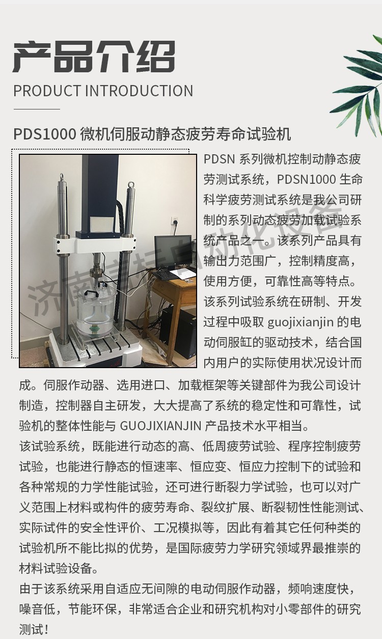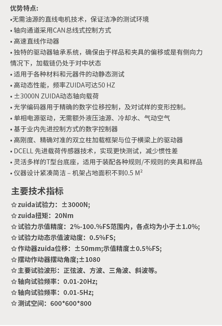 該試驗(yàn)系統(tǒng),既能進(jìn)行動(dòng)態(tài)的高、低周疲勞試驗(yàn)、程序控制疲勞試驗(yàn),也能進(jìn)行靜態(tài)的恒速率、恒應(yīng)變、恒應(yīng)力控制下的試驗(yàn)和各種常規(guī)的力學(xué)性能試驗(yàn),還可進(jìn)行斷裂力學(xué)試驗(yàn),也可以對(duì)廣義范圍上材料或構(gòu)件的疲勞壽命、裂紋擴(kuò)展、斷裂韌性性能測(cè)試、實(shí)際試件的安全性評(píng)價(jià)、工況模擬等,因此有著其它任何種類的試驗(yàn)機(jī)所不能比擬的優(yōu)勢(shì),是國際疲勞力學(xué)研究領(lǐng)域界最推崇的材料試驗(yàn)設(shè)備。 由于該系統(tǒng)采用自適應(yīng)無間隙的電動(dòng)伺服作動(dòng)器,頻響速度快,噪音低,節(jié)能環(huán)保,非常適合企業(yè)和研究機(jī)構(gòu)對(duì)小零部件的研究測(cè)試! 2.優(yōu)勢(shì)特點(diǎn): ?無需油源的直線電機(jī)技術(shù),保證潔凈的測(cè)試環(huán)境 ? 軸向通道采用Can總線式控制方式 ? 高速直線作動(dòng)器 ? 獨(dú)特的驅(qū)動(dòng)器軸承系統(tǒng),確保由于樣品和夾具的偏移或是有側(cè)向力情況下,加載鏈仍處于對(duì)中狀態(tài) ? 適用于各種材料和元器件的動(dòng)靜態(tài)測(cè)試 ? 高動(dòng)態(tài)性能,頻率zuida可達(dá)50 Hz ? ±3000N zuida動(dòng)態(tài)軸向載荷 ? 光學(xué)編碼器用于精確的數(shù)字位移控制,及對(duì)試樣的變形控制。 ? 單相電源驅(qū)動(dòng),無需額外液壓油源、冷卻水、氣動(dòng)空氣 ? 基于業(yè)內(nèi)先進(jìn)控制方式的數(shù)字控制器 ? 高剛度、精確對(duì)準(zhǔn)的雙立柱加載框架與位于橫梁上的驅(qū)動(dòng)器 ? Dcell 先進(jìn)載荷傳感器技術(shù),實(shí)現(xiàn)更快測(cè)試,減少慣性差 ? 靈活多樣的T型臺(tái)底座,適用于裝配各種規(guī)則/不規(guī)則的夾具和樣品