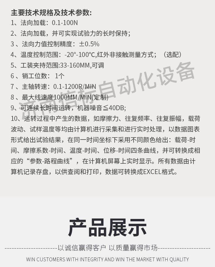 主要技術規格及技術參數 2.1法向加載:0.1-100N 2.2法向加載,并可實現試驗力的長時保持; 2.3 法向力值控制精度:±0.5% 2.4溫度控制范圍:-20°-100℃,紅外非接觸測量方式;(選配) 2.5工裝夾持范圍:33-160mm,可調 2.6 銷工位數: 1個 2.7 主軸轉速:0.1-1200r/min 2.8 最大線速度1000mm/min(定制) 2.9可連續長時間運轉,機器噪音≦40dB; 2.10運轉過程中產生的數據,如摩擦力、往復頻率、往復振幅,載荷波動、試樣溫度等均由計算機進行采集和進行實時處理,以數據圖表形式給出試驗結果,在同一時間坐標下采用不同顏色給出:載荷-時間、摩擦系數-時間、溫度-時間、位移-時間四條曲線,并可轉換成相應的“參數-路程曲線”,在計算機屏幕上實時顯示。所有數據由計算機記錄存盤,以供查閱和打印,數據可轉換成Excel格式。1.主要技術要求及滿足情況:(水平運動總成選配) 為滿足2的各項技術要求,本產品擬采用以下方案 3.1該試驗機由法向加載系統、水平杠桿,扭矩測力系統,溫控系統,其冷卻及潤滑裝置、電氣控制柜及計算機實時數據采集及控制系統(包括軟件)等部分組成; 試驗機主機主要由主機機座、水平機座、法向主軸及其驅動系統、試驗力施加裝置、摩擦扭矩及位移高精度傳感測量系統、試驗力測量及摩擦溫度測量系統等組成;試驗機法向加載系統采用杠桿+砝碼,精度高,可靠性好;水平加載系統采用直線電機作為加載系統,控制精度高,相應快,主機機座采用較大質量的鑄鐵件,固有頻率高,吸震抗震性能好,箱體座也是采用鐵件經數控鏜加工后將電主軸牢固鎖緊在箱體座中,這樣可以提高加載工作時的平穩性。