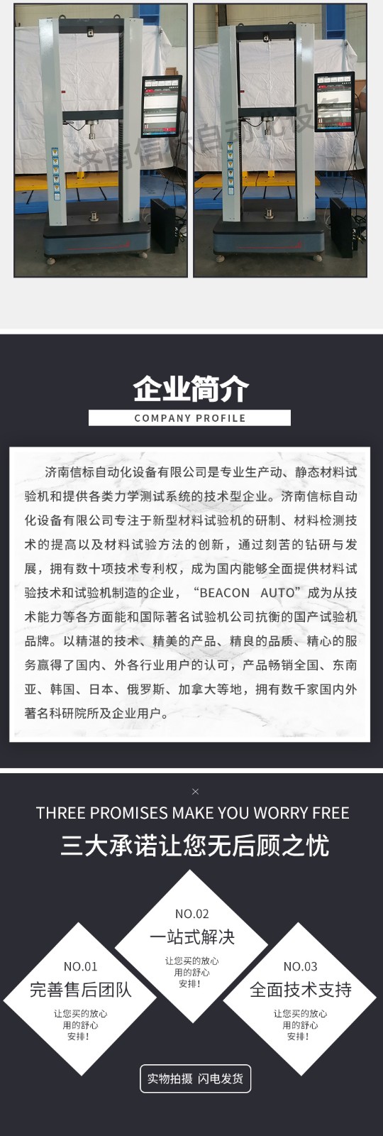 WDW-20微機控制電子萬能試驗機材料抗拉強度拉伸測試儀器測量參數: 1. 最大試驗力: 10/20/30/50kN 2. 試驗力測量范圍: 0.4%--100%。 3. 試驗力示值精度:優于示值±1% 4. 試驗力分辨力:1/500000 5. 橫梁位移測量精度:分辨率高于0.0025mm 6. 變形測量精度: ±0.5% 7. 試驗速度范圍:0.0002—500mm/min,無級調速 8. 速度控制精度:±1%(0.0002~50mm/min); ±0.5%(50~3500mm/min) 9. 恒力、恒變形、恒位移控制范圍: 0.2%-100%FS 10.恒力、恒變形、恒位移控制精度: 設定值<10%FS時,設定值的±1.0%以內 設定值≥10%FS時,設定值的±0.1%以內 11. 變形速率控制精度: 速率<0.05%FS時為±2.0%設定值內 速率≥0.05%FS時為±0.5%設定值內 12. 試驗空間: A.拉伸空間:1000mm B.壓縮空間:1100mm C.寬度:450mm 13.下工作臺:450*250 14. 壓盤尺寸:φ100 mm 15. 整機電源:單相,220V±10%,50Hz,功率:750 W 16. 工作環境:室溫—35℃,相對濕度不超過80% 17. 主機尺寸: 870×730×1750mm 18. WDW-20微機控制電子萬能試驗機材料抗拉強度拉伸測試儀器重量:400 kg WDW-20微機控制電子萬能試驗機材料抗拉強度拉伸測試儀器產品配置: 1、主機 一套 2、松下A7全數字伺服電機及伺服驅動器; 一套 3、高精度負荷傳感器; 5kn/1kn/500N/200/ 各一支 4、Hiwin精密滾珠絲杠; 2支 5、光電編碼器(2500線,內置); 1支 6、夾具:滿足海綿/汽車座椅所需工裝 1套(有多種) 7、三閉環測量系統一套,采用力,位移,應變等多種控制方式,試驗過程中可實時顯示力-位移,力-時間,應力-應變等多種試驗曲線,并可自動得出最大負荷,拉伸強度,斷裂伸長率等多種結果參數。 8、HP品牌計算機,21寸液晶顯示器; 9、打印機:HPA4彩色噴墨打印機; 10、專用試驗軟件:可執行GB,ISO,JIS、DIN,ASTM等多種試驗標準,全開放式,功能強大,方便操作,免費提供升級軟件,并可根據用戶需求自行編輯試驗軟件。
