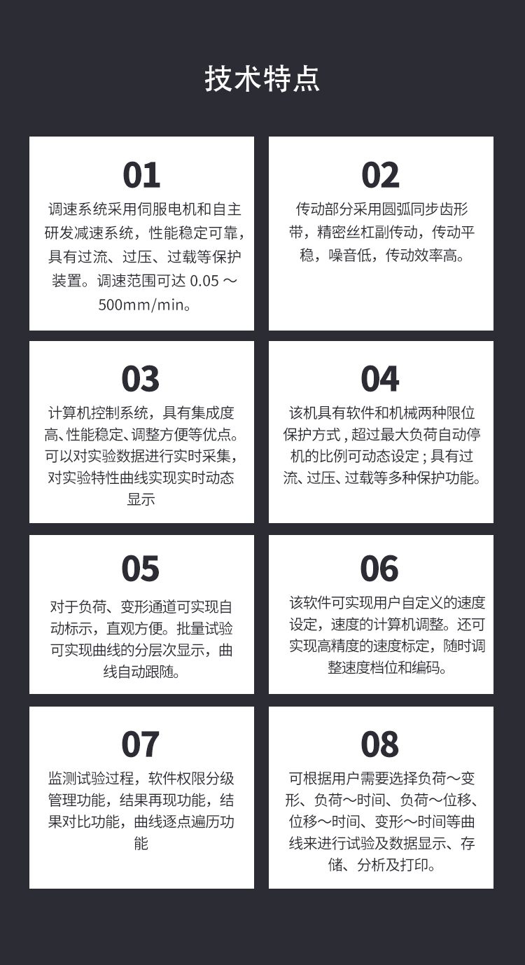 該機采用調速精度高、性能穩定的全數字伺服調速系統及步進電機作為驅動系統,控制器作為控制系統核心,以WINDOWS為操作界面的控制與數據處理軟件,實現試驗力、試驗力峰值、橫梁位移、試驗變形及試驗曲線的屏幕顯示,所有試驗操作均可以通過鼠標在計算機上自動完成。良好的人性化設計使試驗操作更為簡便。綜合以上各項技術,該機可以近乎完美的實現試驗力、變形及位移等參數的閉環控制,可實現恒應力、恒應變、恒位移等控制模式,并且各種控制模式之間可以平滑切換。該機完全滿足國家標準GB/T228-2002《金屬材料室溫拉伸試驗方法》的要求,同 時可根據GB、ISO、JIS、ASTM、DIN及用戶提供多種標準進行試驗和數據處理,并且具有良好的擴展性。